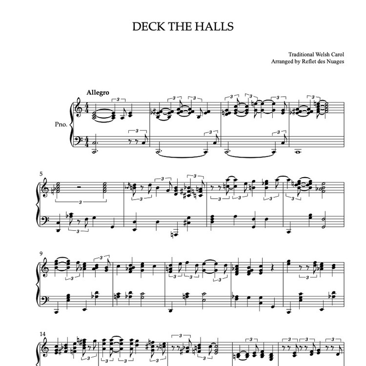 Sheet music of Deck the Halls arranged for piano solo