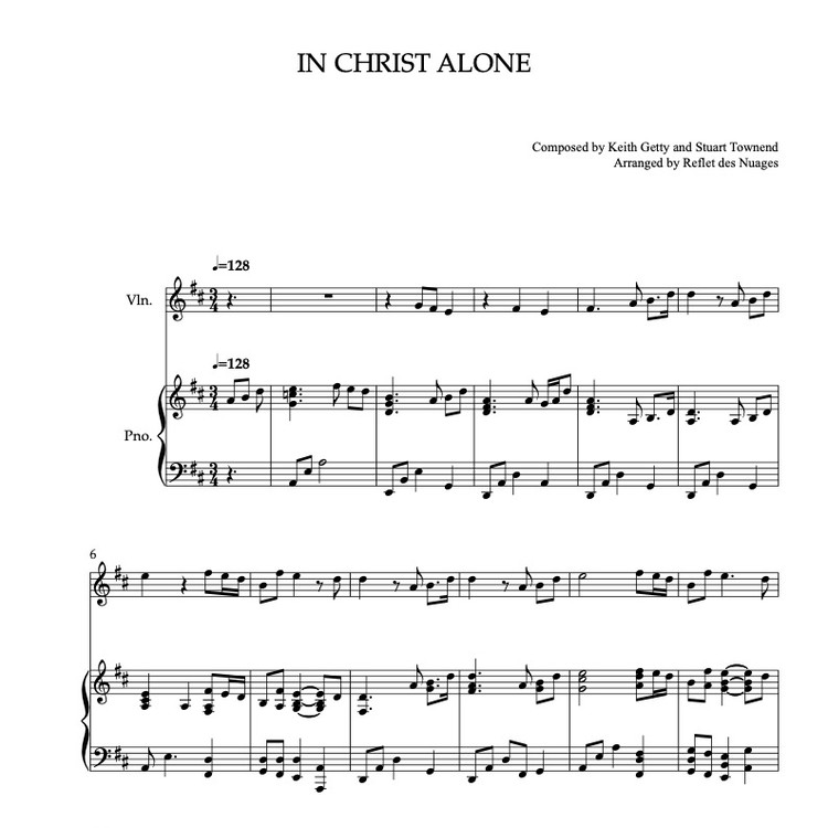 Sheet music of In Christ Alone arranged for violin and piano duet chamber ensemble