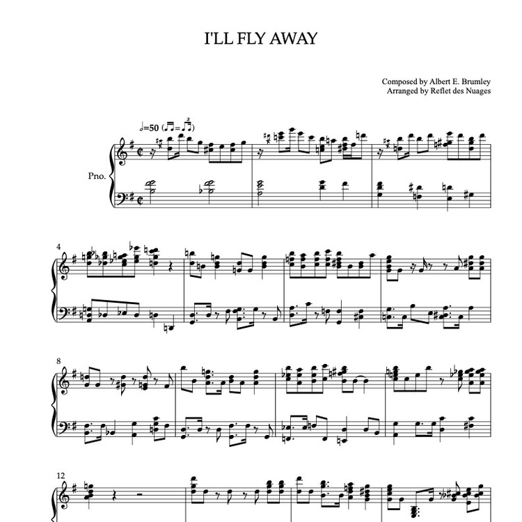 Sheet music of I'll Fly Away arranged for piano solo