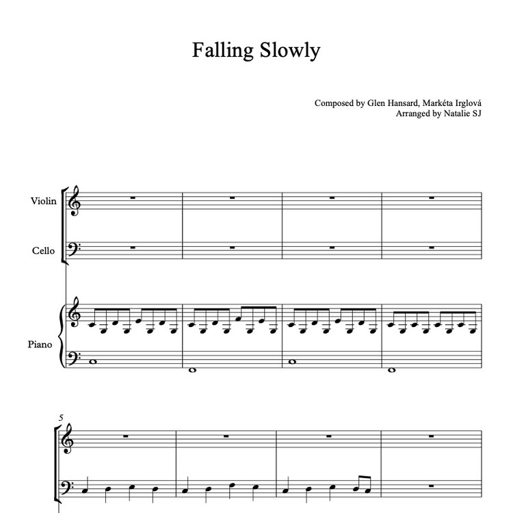 Sheet music of Falling Slowly arranged for violin, cello and piano trio chamber ensemble
