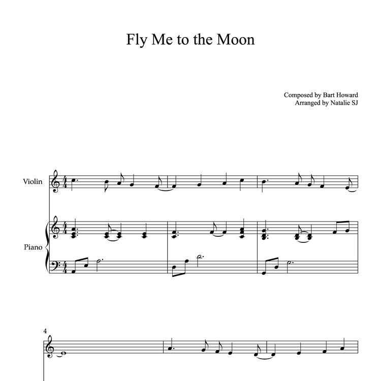 Sheet music of Fly Me to the Moon arranged for violin and piano duet chamber ensemble