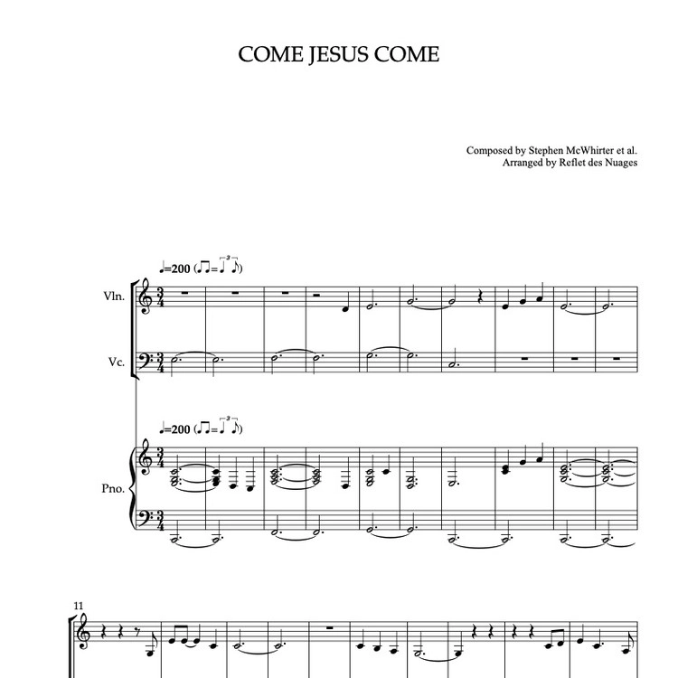 Sheet music of Come Jesus Come arranged for violin, cello and piano trio chamber ensemble