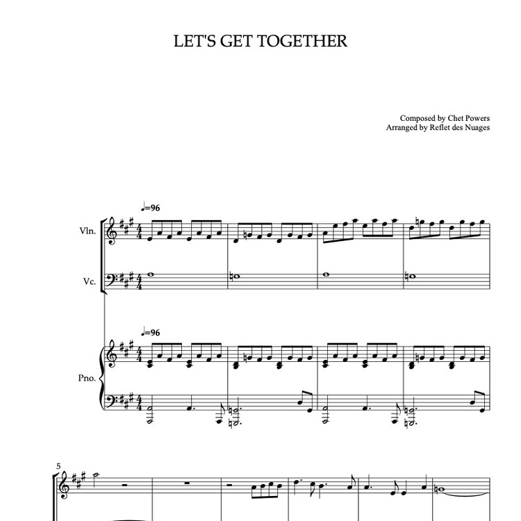 Sheet music of Let’s Get Together arranged for violin, cello and piano trio chamber ensemble